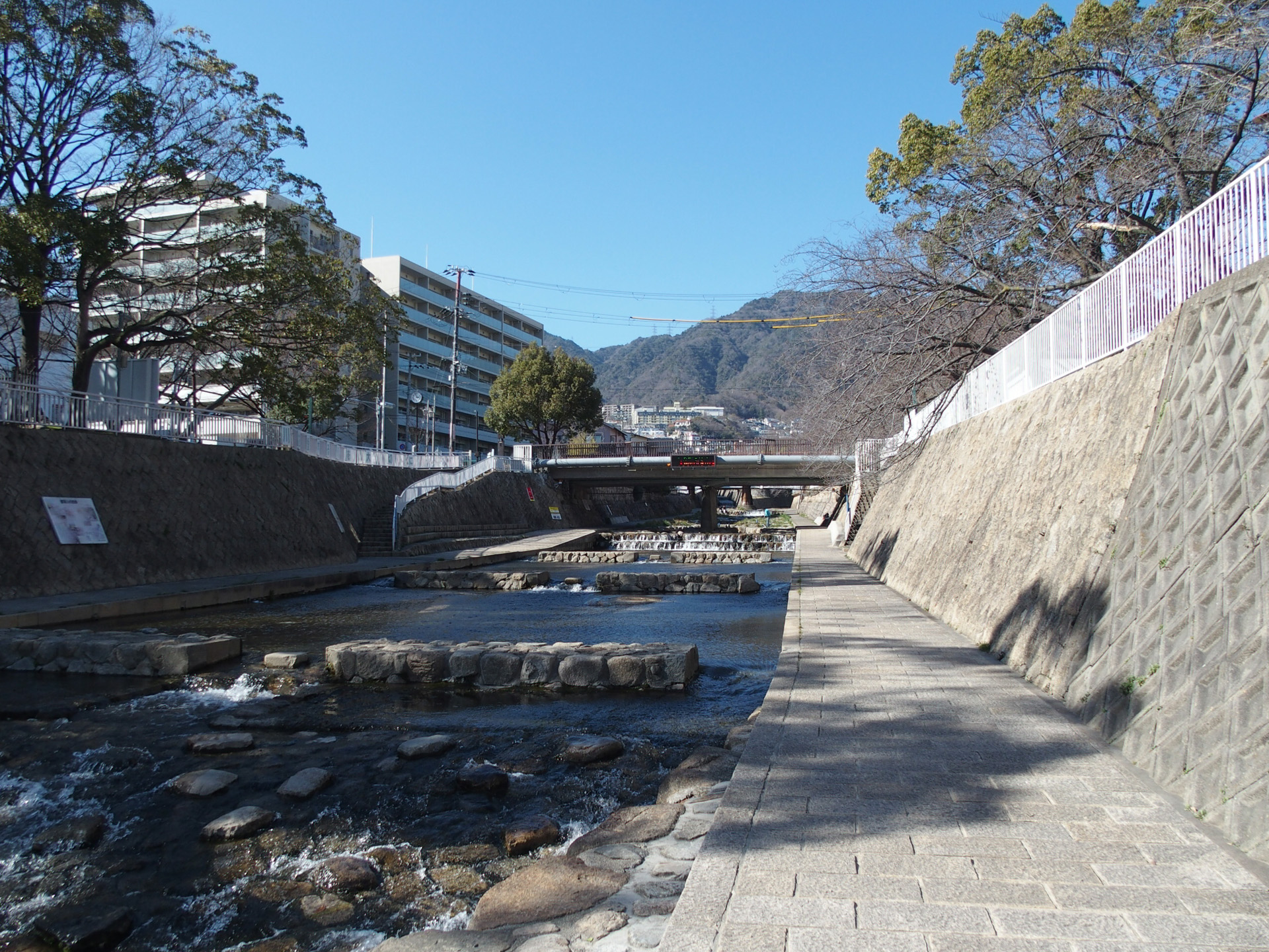 阪神『大石』駅を出て川沿いを北上後、南下して海に出ています。